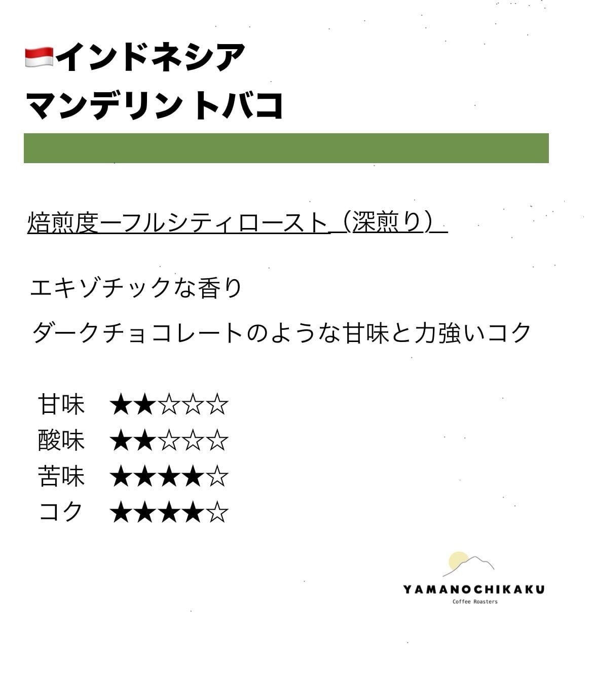 インドネシア産の上質なコーヒー豆、マンデリントバコは香り高く、濃厚な味わいが特徴で、コーヒー好きならぜひ一度試して欲しい逸品です。